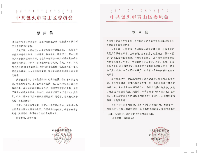 一机集团📻、北重集团收到中共包头市青山区委员会、青山区人民政府发来的慰问信 信中指出,在青山区抗击疫情最紧要的关头🏂,一机集团、北重集团雪中送炭👂🏿、迅速响应🧺,分别紧急抽调百余名党员干部参与到地区疫情防控工作中,为全区上下众志成城🔷,打赢疫情防控的人民战争🤱🏽、总体战、阻击战增添了宝贵力量,有力支持了全区疫情防控工作👨🏿🦳,彰显了一机集团、北重集团在公共危机面前挺膺负责🌈🕵🏽♀️、挺身而出的社会责任,胸怀大局、无私奉献的社会担当。 一机集团党员干部驰援青山区疫情防控一线 北重集团党员干部驰援青山区疫情防控一线 来源/豫西集团红宇专汽公司、一机集团、北重集团
