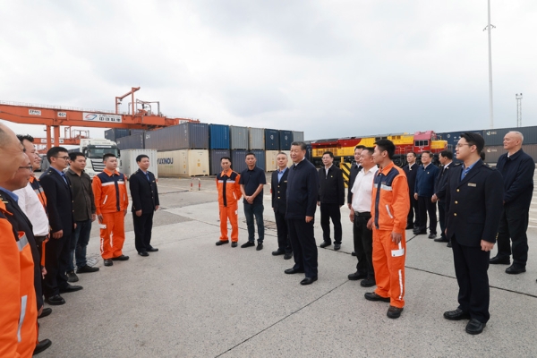 4月22日至24日📋👨🏿‍⚕️,中共中央总书记、国家主席、中央军委主席习近平在重庆考察🦹🏻。这是22日下午,习近平在重庆国际物流枢纽园区重庆铁路集装箱中心站,同货车司机、列车司机💍、装卸工人、场站管理人员等亲切交流。